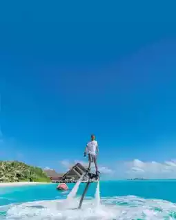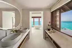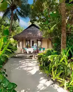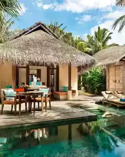 Forty overwater villas are suspended above the clear lagoon and are adjacent to another natural island.