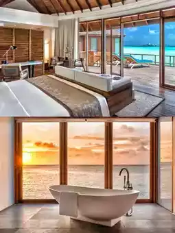 Suspended over crystal-clear lagoons and surrounded by a stunning natural island, the 40 overwater villas feature natural and soothing tones, creating a warm and natural feel.