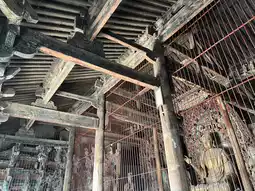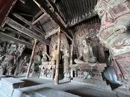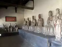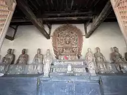 There is a mountain gate on the south side and surrounding walls. The five-bay main hall has a six-purlin gable roof and is three bays deep, with a solid and beautiful structure. A plaque with the words "Vilu Zhenjing" hangs in the middle of the main hall door, which was written by Li Hang from this village in the ninth year of the Daoguang reign of the Qing Dynasty. There are nine main Buddha statues in the hall, as well as many scattered statues and hanging sculptures. In the middle is Sakyamuni, with Kasyapa and Ananda on both sides, Manjusri and Samantabhadra on both sides, and two Bodhisattvas on both sides, and two Vajra statues on the outside. The entire group of statues has a harmonious rhythm, appropriate arrangement, exquisiteness, lifelikeness and rich artistic imagination. It is very different from general replicas and is of considerable value for the study of traditional sculpture techniques.