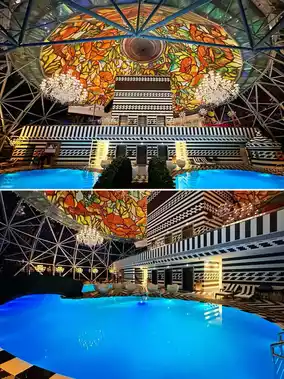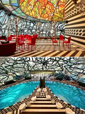 Marcel Wanders’ design style showcases many Arabic elements – huge columns with golden eggs, a “tree of life” made of flowers, falcon video art, gorgeous stained glass and intricate mosaics, all of which add to the most luxurious and holistic experience of the hotel – every restaurant at the Mondrian Hotel Doha is so beautiful! The Arabian restaurant Walima has a great atmosphere, and there is also a hidden cigar bar Smoke & Mirrors inside. The Arabian Night Party on the outdoor terrace is even more exciting! The sky swimming pool on the rooftop is breathtakingly beautiful whether it is day or night!