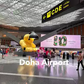 #DohaQatar Airport is considered a very large airport. The landmark for checking in is the yellow bear. This area is the center for walking to various gates. There is a shuttle bus service to travel in the airport because each gate is very far from each other.