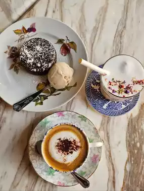 This time, I ordered a cappuccino, Earl Grey latte, and lava chocolate cake. The cappuccino had a smooth foam and went down effortlessly, while the foam on the Earl Grey latte was sweet and creamy, making it absolutely delicious. The lava chocolate cake was recommended by the staff, and it came with ice cream, which made for a perfect combination!