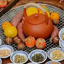 Served with six kinds of condiments + orange, sweet potato, chestnut, persimmon, oh!