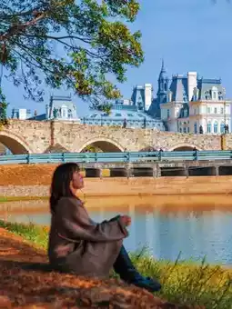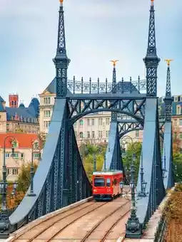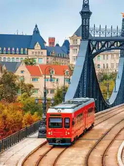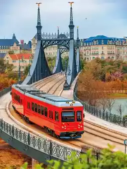 Standing on the bridge, you can take a photo with the tram, and the background is a large European-style building. It's easier to get good shots if you have a telephoto lens