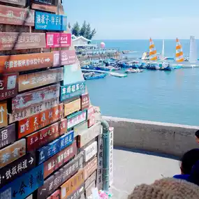 During the day, Nanmen Bay is a vibrant spectacle. Even though the scorching sun scorches the embankment, it can't resist the enthusiasm of tourists. Many enjoy sitting under umbrellas on the embankment, sipping tea and chatting. The soothing sound of waves crashing against the rocks, the cool breeze, and the breathtaking scenery beneath the blue sky and white clouds make it all worthwhile.