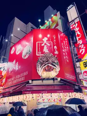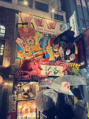 Despite the weather, the streets are always alive with locals and tourists alike, gazing in awe at the towering Glico Man neon sign or the giant mechanical crab at Kani Doraku. Even when it rains, Dotonbori's vibe doesn't dampen — the umbrellas might pop open, but the excitement in the air never fades. You can duck into cozy izakayas or sip on an iced matcha at a café to escape the elements, all while enjoying the sensory overload of this famed district.