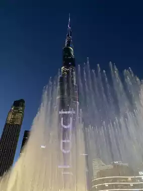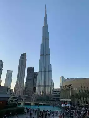 🇦🇪Hop back on the train to Burj Khalifa. Follow signs toward the Burj fountains to get this iconic view of the world’s tallest skyscraper. If you want to take a break, there are numerous restaurants surrounding the fountains with great views of the Burj. Stick around until after the sun goes down to see a fountain show. As of December 2023, they begin every half hour from 18:00-23:00.