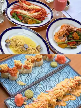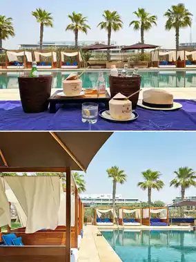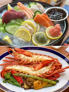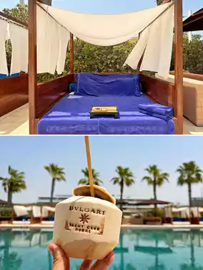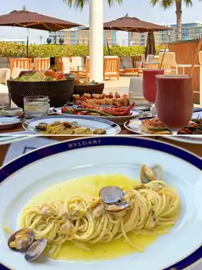 Bulgari Hotel Dubai has the first yacht club in the world of Bulgari. The club is equipped with an outdoor swimming pool, bar, member lounge, and a yacht club Italian restaurant that mainly serves various fish dishes. Enjoying the afternoon sun in the yacht club's swimming pool is an extremely comfortable choice! I specifically reserved a sofa bed by the club pool. The waiter will thoughtfully serve sparkling water, sunscreen spray, and coconuts and fans with the Bulgari Logo. It's so suitable for taking pictures! On the first night of my stay, I experienced the Italian restaurant in the club. Of course, I can't miss the food moments by the pool, sushi, sashimi, pasta, and various seafood are all superb!