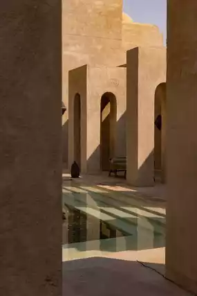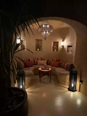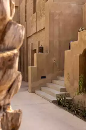 It takes about an hour to drive from the airport. Although the location is a bit remote, it offers a perfect tranquil environment. The drive from the city is smooth, but it's recommended to arrange transportation in advance, as public transport in the desert is inconvenient. Upon arrival, we were immersed in a strong Arabian atmosphere, as if we had stepped into a fairy tale from One Thousand and One Nights.