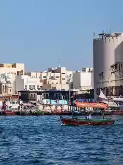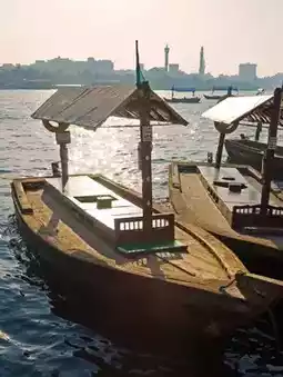 Sail across Dubai Creek on a traditional wooden Abra, with old walls on one side and skyscrapers on the other—a surreal blend of past and present.