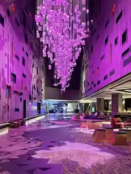 Located on the outer crescent of the man-made Palm Jumeirah, the W Dubai – The Palm is an iconic landmark with its signature silver wave-shaped facade. All rooms and public areas offer direct views of the Arabian Gulf, and the hotel is connected to the mainland by a private causeway. The 3D dynamic art installation at the lobby entrance creates a striking visual contrast with the traditional Arabian patterned floor tiles. All rooms feature a gradient color scheme and floor-to-ceiling windows leading to private balconies. Some suites even have circular bathtubs with direct sea views, and the in-room minibars are stocked with local treats like date chocolates.