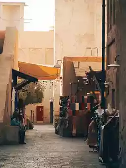 In the evening, the setting sun paints the streets and wind towers a golden orange, stretching light and shadow across alleyways and rooftops. As the streetlights come on, the bustle of the market blends seamlessly with the gentle night. Lights from cafés filter through carved windows onto the cobblestone streets, and the aromas of spices and sweets drift in the breeze. Under the night sky, the silhouettes of the wind towers appear soft and ancient, while the tranquility of the alleyways blends with the lingering charm of the market, creating a sense of slow passage of time.