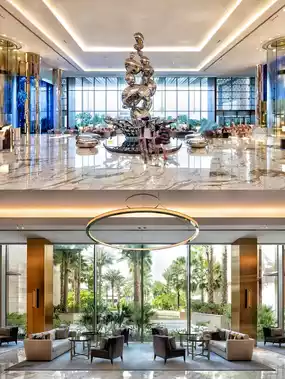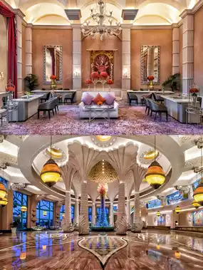• Architectural Beauty: The hotel resembles a floating crystal palace, with a 22-story-high atrium hanging breathtaking glass artworks. When the lights come on at night, it looks like stars falling from the sky. My favorite is the infinity pool on the 18th floor, where lying there feels like floating above the Arabian Gulf!