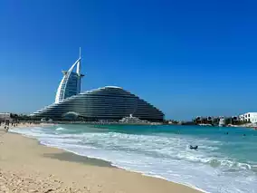 Jumeirah Beach is a must-visit seaside destination in Dubai, renowned for its fine white sand, crystal-clear waters, and stunning views of the Burj Al Arab. Here are the must-try activities: