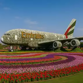 • Floral Sculptures – Giant flower displays shaped like castles, animals, and even an Emirates A380 plane.