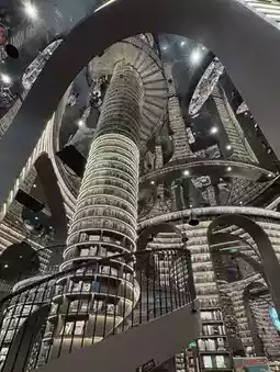 The highlight is the spiral staircase, which looks like a grand column of bookshelves.