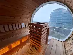 The open-air leisure platform is furnished with parasols and tables and chairs. ☂️