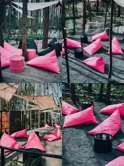 The pink sofa is matched with a black oil barrel. The contrasting color design is very eye-catching. Behind it are green trees and sunshine, which makes you feel relaxed.