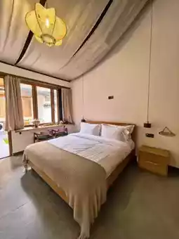 ❤ Drive west from Chengdu and turn onto a winding mountain road. When the scenery outside the window changes to serene mountains, and after passing the last section of a slightly narrow jungle dirt road, Jishang Qingcheng Mountain Villa, surrounded by fir and ginkgo trees, suddenly appears before your eyes. After getting out of the car, the sweet, fresh air rushes into your nostrils. Stepping into the courtyard of the guesthouse, the pebble path and old wooden tables appear simple yet warm.