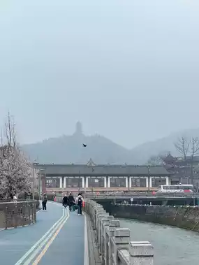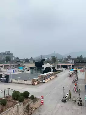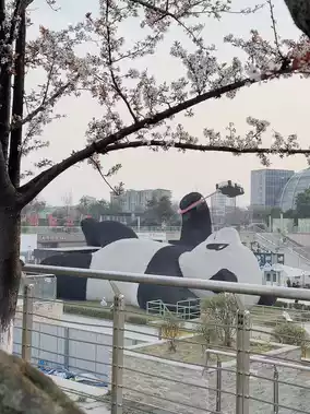 Anyone who visits this city must stop by to take a picture with this giant panda selfie. It is easy to get to, right next to the train, near the ancient bridge, and near the ancient city of Guanxian. If you come to this area, you have to walk around and visit everything. We came during spring. There were beautiful trees blooming on top. You could go up and take pictures of both flowers and pandas. The angle was just right. It was very beautiful.