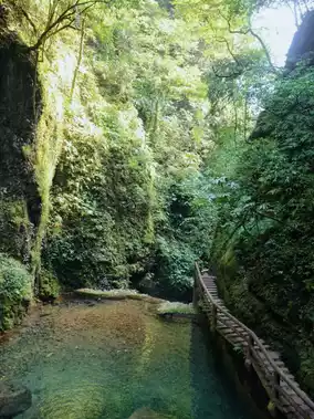 Tai'an Ancient Town → Wulong Gully → Longyin Gorge Plank Path, featuring stone paths and wooden walkways intertwined with waterfalls and suspension bridges. Perfect for summer water play and effortless photography.