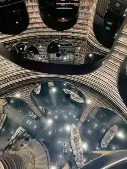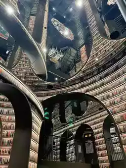 The ceiling reflects the bookshelves endlessly, making you feel like you’re walking through a never-ending library. It’s visually surreal and perfect for photography.