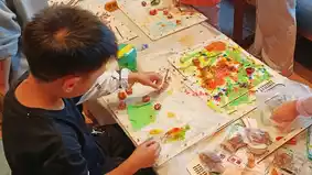 You can choose a small scarf or a canvas bag. Staff will guide you step-by-step on tying and dyeing. Kids aged 4+ can complete it independently, and you can take the finished product home as a souvenir. It's recommended to wear dark clothes to prevent paint stains.
