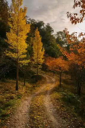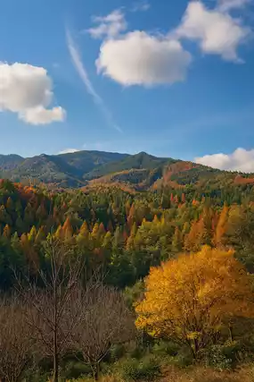 Golden ginkgo, fiery red maple leaves, deep green pines and cypresses…