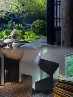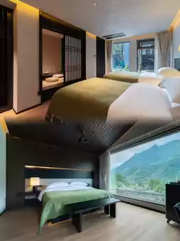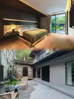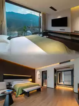 Qingcheng Mountain Shanju Fu Private Hot Spring Homestay masterfully blends modern minimalist style with Song Dynasty courtyard aesthetics. White walls and black tiles paired with floor-to-ceiling glass windows frame the entire mountain forest and sea of clouds right from your room. It’s recommended to bring a plain long robe; standing by the window will make you feel like you’re in a scene from "Crouching Tiger, Hidden Dragon."