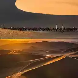 2️⃣Singing Sand Dunes & Crescent Moon Spring: "When will the crescent moon set over Jade Pass, its clear light transformed into spring water?" This poem perfectly describes the beauty and mystery of Crescent Moon Spring. The spring is not only a masterpiece of nature but also carries countless historical and cultural meanings. When you ride a camel, accompanied by the gentle sound of camel bells, walking through the desert, you can almost see the bustling scenes of ancient Silk Road merchants. At sunset, the desert sunset view is intoxicating. At night, there's also a romantic starry sky chorus with thousands of people, allowing you to feel the charm of music and the tranquility of nature under the vast starry sky.