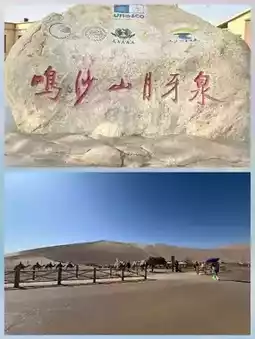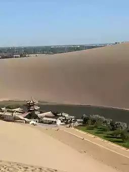 Singing Sand Mountain & Crescent Moon Lake ~ Crescent Moon Lake, formerly known as Wuwa Pond, Shajing, and Yaoquan, has been one of the Eight Scenic Spots of Dunhuang since the Han Dynasty and became known as Crescent Moon Lake after the Qing Dynasty. The lake's waters have never dried up for a thousand years. A popular story tells of the Moon Fairy and the Divine Sand Fairy. The fairy left the moon by the spring, and the Fairy repeatedly tried to fill it with sand, but the Fairy used her magic to blow the sand away, thus allowing Crescent Moon Lake to remain dry for a thousand years!
