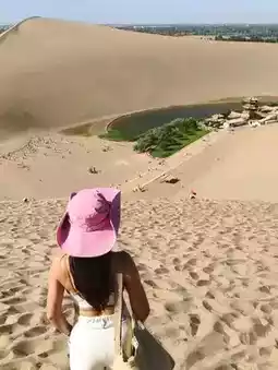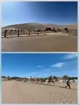 To see Crescent Moon Lake, you have to hike up the sand dunes. The journey is difficult because the sand is so, so, so fine. Fortunately, there are wooden walkways. This time, we rode camels across the dunes, from Singing Sand Mountain all the way to Crescent Moon Lake. Thousands of camels snaked up the mountain, reminiscent of an ancient caravan through the desert. At dusk, you can experience a Silk Road journey!