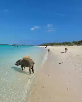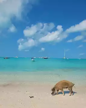 - Where are the happiest pigs in the world? The answer is definitely: the Bahamas! Here, the pigs' daily routine includes: eating delicious food, swimming in the azure Caribbean Sea, and sunbathing/playing on soft sandy shores~