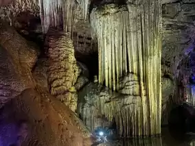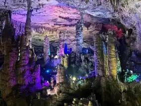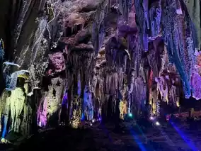The stalactite caves are bizarre and unique, locally known as 'Fairy Caves'. Located on Duxiu Peak between Dushan and Libo, the entrance is halfway up the mountain. The trails are well-maintained and illuminated with colorful lights, further highlighting the peculiar rocks and formations, creating a mysterious and otherworldly atmosphere.