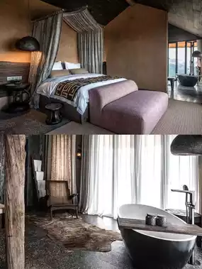 19 detached villas are scattered across 400 acres of untouched mountaintop. The east-facing terraces offer sunrise and sea of clouds views ☁️, while the west-facing terraces boast sunset and starry sky views ✨. Each room features 200° panoramic floor-to-ceiling windows, allowing you to watch the mountain mists from your bed. The best part is the private hot spring 🌋! The cliffside hot spring pool directly faces the valley, where you can soak and watch wild cherry blossoms fall. The ambiance is simply perfect.