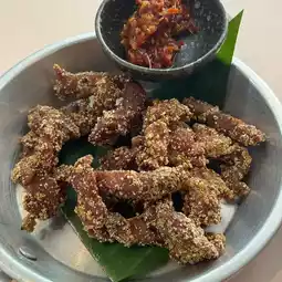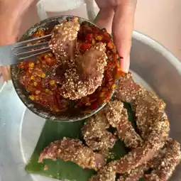 #หมูตกรถ Well marinated, not too salty, fragrant with roasted rice, not too hard and soft when fried, eat it hot with sticky rice, it's just right! (110 baht)
