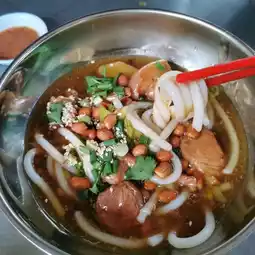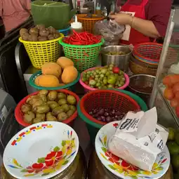 #Somtam Waiwai with friends The santol soup has fermented fish sauce, spicy first, sour then lightly salty, but it gets saltier when eaten with the crispy noodles that are already salty. Add vegetables, pork roll, jellyfish, sprinkle with ground peanuts (110 baht)