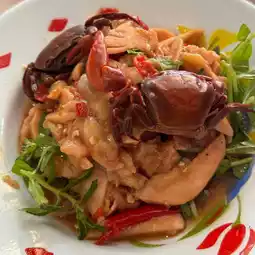 #Somtam with pickled crab, soft santol skin, not hard, not astringent, the santol seeds are sweeter than sour. The santol soup has a light fermented fish sauce, the fermented fish sauce is easy to eat, we thought there was no fermented fish sauce, sweet, spicy, sour, not very salty. But if you slurp the pickled crab = really salty. This dish also has morning glory. I've only heard the name from the series, just got to eat it this time, it smells good, love it