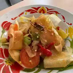 #Somtam Chu Lao Similar to Luang Prabang santol, thinly sliced papaya, fermented fish sauce is easy to eat. If you don't eat fermented fish sauce, we think it's okay. The spiciness comes from both dried and fresh chilies. Sour from the ma-uek and salty in order, not too sweet (65 baht)