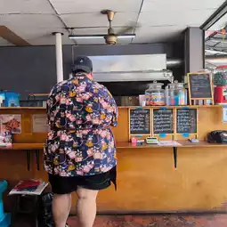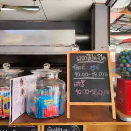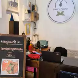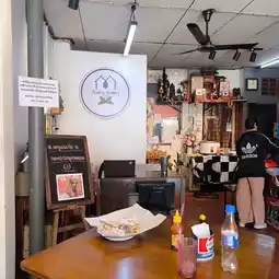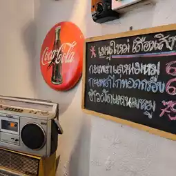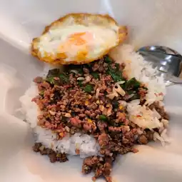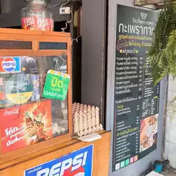 It is a small roadside restaurant, but the taste is not small at all. The shop is like a 2-story house that has been converted into a restaurant. There are about 3-4 tables inside, including about 3 tables outside. The food menu of the shop focuses mostly on krapow, but there are meats such as pork, beef, chicken, seafood. In addition, there are krapow with pork sausage, various krapow, and some days there is a special menu. The day I went, it was krapow with crispy fried catfish. In addition to krapow, there is also stir-fried bell peppers and fried garlic. We can order meat as desired. I ordered krapow with minced beef and fried egg. The shop asked if I wanted it spicy or medium. I ordered medium spicy. The taste was very delicious, well-rounded, and spicy enough. The shop does not stir-fry each dish. The shop serves it on a vintage plate with a paper plate. In addition, there are also chrysanthemum tea, iced tea, or soda menus. There will be a lot of people at noon, and there will also be many riders waiting to receive orders. It would be better to go before noon or after the afternoon.