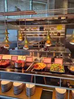 A diverse selection including live-cooked pho, Vietnamese dishes, and an egg station