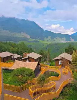 🎁- **Yibu Qiannian**: An immersive Yi culture experience with uniquely designed rooms blending green luxury and primitive charm. Enjoy mountain-view terraces, private hot springs, and breathtaking sunrises, sunsets, and starry skies 🎀 Every moment here is poetic and relaxing—unwind on the terrace, read in the library, sip tea in the lounge, play games in the card room, or try hands-on activities like fruit picking, tea-making, and flower arranging 🍒 The butler service ensures a carefree stay, where worldly worries fade away, leaving only peace amidst the serene landscape.