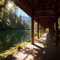 3. Walk through the Ancient Forest Corridor: Towering ancient trees with sunlight filtering through the leaves, dry leaves rustling underfoot, and occasional encounters with squirrels and birds.