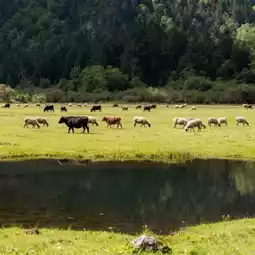 4. Check-in at Still Water Pasture: Cattle and sheep graze on the vast meadow. You can rent Yi ethnic costumes for photos (30 RMB/set), use cattle and horses as backgrounds for stunning pastoral shots, and even try milking sheep (10 RMB/time).