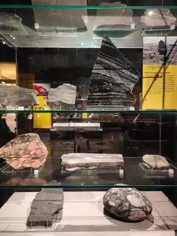 The exhibit reveals how stone becomes stratified — compressed over millions of years by the weight of oceans, continents, and shifting plates. Sand becomes sandstone. Mud becomes shale. Even fossils appear, like cameo brooches pressed into the Earth’s diary. You can trace the folds and faults where rock has bent, cracked, and reformed — a choreography of geological resilience.