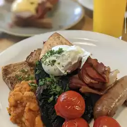 Roasted flat mushroom, blistered cherry tomatoes, wilted spinach, potato scone, veggie haggis, homemade beans, poached egg and buttered granary toast