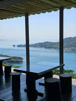 Tomin Chaya is an open-air cafe located in Kareiyama Observation Park, a spectacular spot on the Shimanami Kaido in Miyakubo-cho, Imabari City.