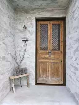 The interior of the shop is gray and antique-style,