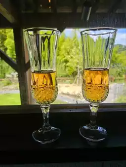 A welcome drink is prepared near the entrance of the shop, and you take a glass and move to your seat.