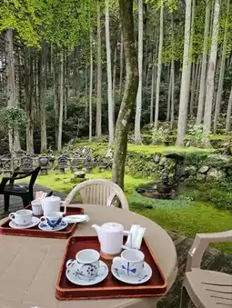 On a nice day, you can enjoy matcha, coffee, and sweets on the outdoor wooden deck.
